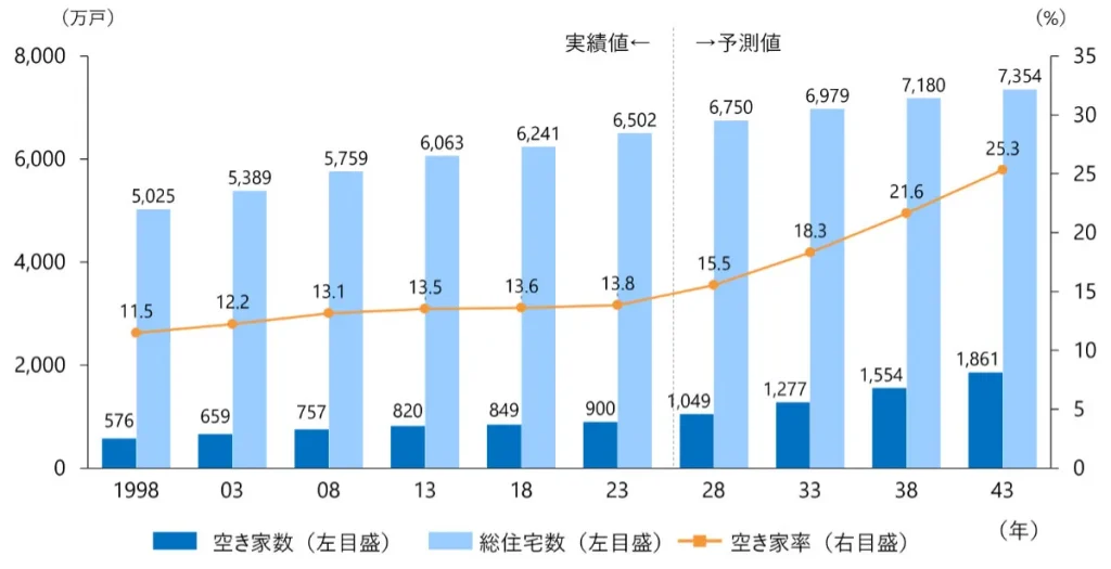 総務省の住宅・土地統計調査などに基づく予測では、今後の空き家率は25%前後に落ち着く可能性が高いとされています。